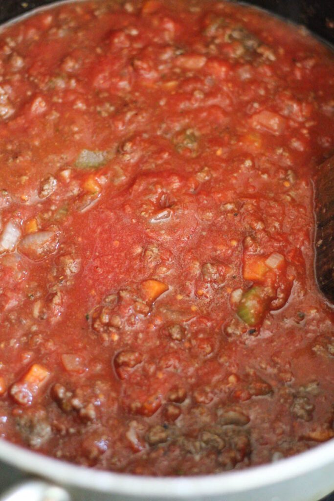 Add the crushed tomatoes, mix, and bring to a boil. Once boiling, cover, reduce to a simmer (low), and cook for 1 hour, giving it a stir every now and then.