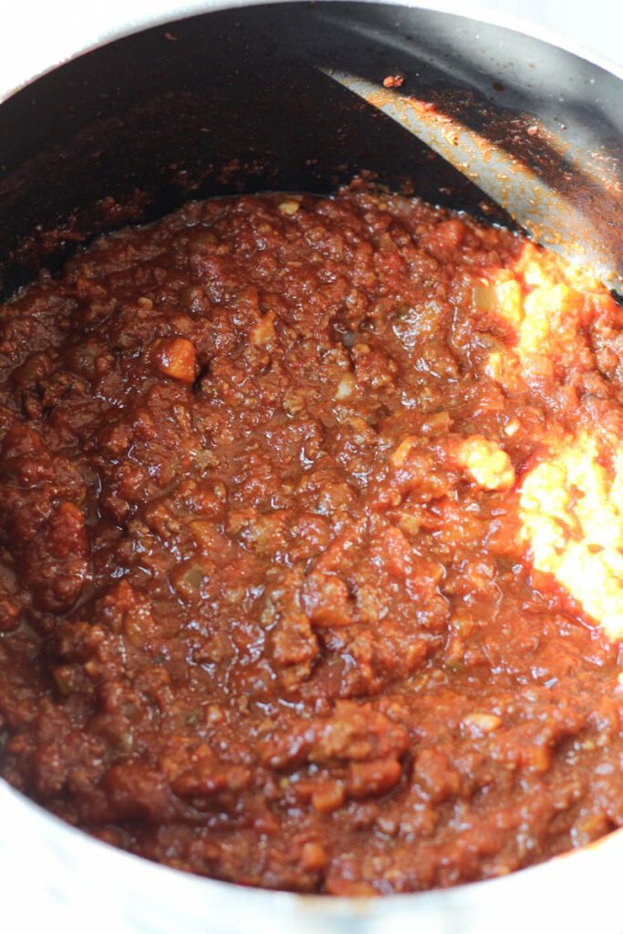 Add the spices and mix to combine. Add the beef broth, mix, and scrape the bottom if needed. Cook this, stirring continuously, for a minute or two.