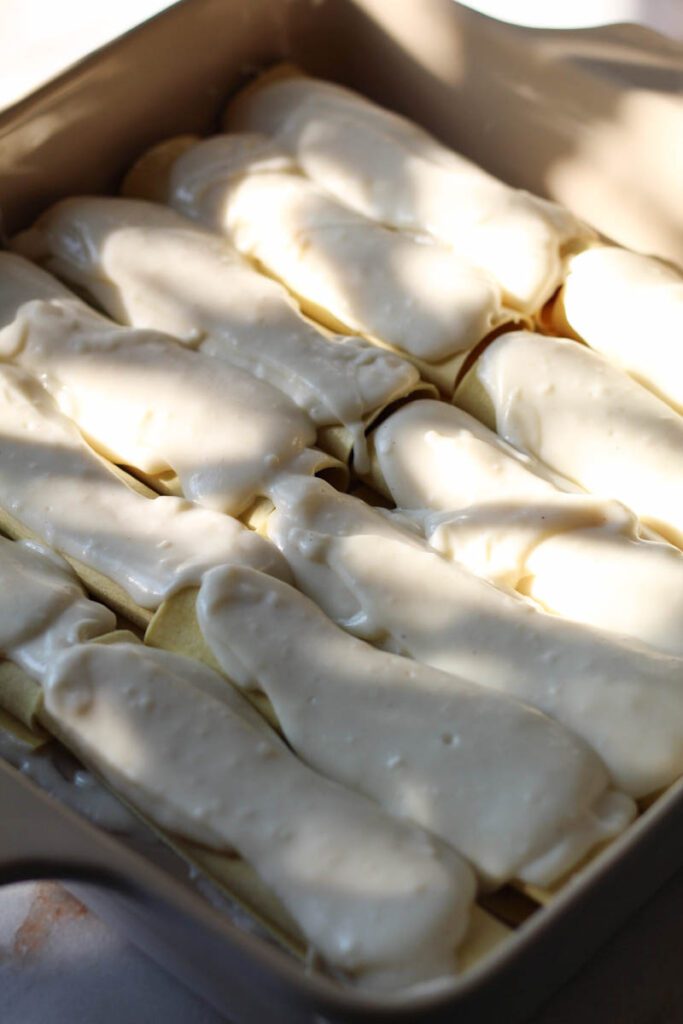 Pour the remaining béchamel sauce over all of the cannelloni.